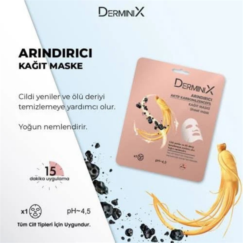 DERMİNİX ARINDIRICI AKTİF KARBON & ZENCEFİL KAĞIT MASKE 25GR. Yağlı, Gözenekli ve Siyah Noktalı cilt kusurlarının giderilmesini isteyenler için özel olarak tasarlandı. Zencefil ve Aktif Karbon içeriğiyle zenginleştirimiş yağ ve kiri yok eden kağıt maske. Yağlı, gözenekli ve siyah noktalara sahip cildin arınmasında ihtiyacı olan içeriği 15 dakikada elde edin. Cildinize derinlemesine nüfus eder, yapıkanlık hissi bırakmadan nemlendirir. Bambu dokusuyla cildinize rahatlık anı yaşatmanızı sağlar. Herkes için ulaşılabilir, cilt ve doğa dostu ürünler üretmek. Derminix, uzun araştırmalar ve ar-ge çalışmaları sonrası 2020 Yılında "Herkese ulaşılabilir ve kaliteli cilt bakım ürünleri sağlamak" mottosuyla istanbul'da kuruldu. 2021 Yılında satışa başladığımız günden itibaren sürekli yükselen bir ivme ile yolumuza devam ediyoruz. Cildin ihtiyaçlarına uygun ürünler üretirken herkesin ulaşabileceği fiyat segmentinde kalmaya özen gösteriyoruz. Amacımız "Herkes için ulaşılabilir, cilt ve doğa dostu ürünler üretmek" Derminix ürünlerinin üretim aşamasında çevreye ve doğaya saygılı ürünler üretmeye özen gösteriyoruz ve dermatolojik testlerimizin hiçbirinde hayvanlar üzerinde test yapmıyoruz. Aynı zamanda içeriklerimizde de Paraben ve SLS kullanmıyoruz. Ürge (ürün geliştirme) ve Arge (araştırma-geliştirme) çalışmalarımızda, müşterilerimizin talepleri doğrultusunda gerekli araştırmaları yaparak ürünlerimizi geliştirmeye ve ürün skalamızı genişletmeye devam ediyoruz. Mevcutta bulunan cilt bakım serumlarımız, ampullerimiz, kapsüllerimiz, cilt temizleme ürünlerimiz ve peelinglerimiz, selülit kremi ve güneş yağlarımız, saç ve yüz maskelerimize ek olarak yeni ürün araştırma ve geliştirme çalışmalarımız hızla devam etmekte.