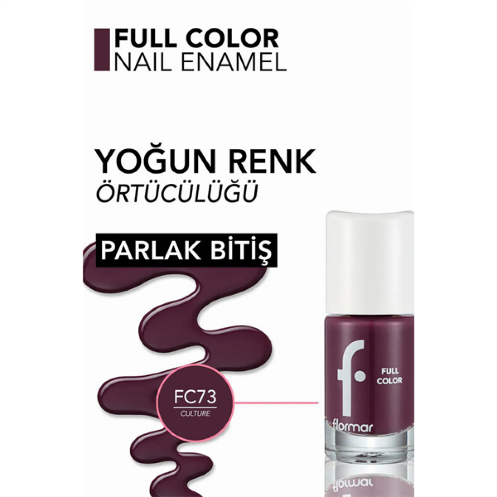 • Flormar Full Color Nail Enamel, parlak bitişli bir oje çeşididir. Yüksek pigmentli yapısıyla yoğun renk verme özelliğine sahiptir. Uzun süre kalıcı etki sunar ve kolay soyulma yapmaz. Silindir cam şişesi ve ince uçlu aplikatörü bulunur.