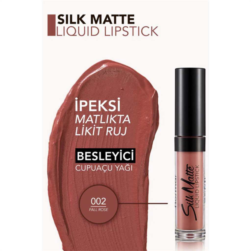 • Her mat ruj kullandığında dudaklarının bir süre sonra kuru ve sönük göründüğünü mü fark ediyorsun? Flormar Silk Matte Liquid Lipstick’le, seni o çok sevdiğin mat dudak makyajından alıkoyan tüm sebepleri geride bırakabilirsin! Açık gül kurusu 002 Fall Rose rengiyle tüm cilt tonlarına uyum sağlayacak bu mat likit ruj, dudaklarında istediğin çarpıcı görünümü yakalamanı sağlayacak.