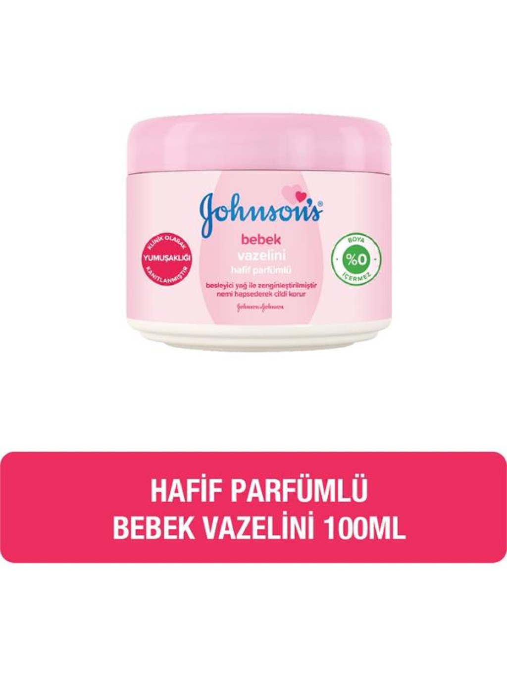 -Johnson's® Bebek Vazelini, hipoalerjeniktir.-Pediatrist dermatolog tarafından test edilmiştir.-Boya içermez.-Yumuşaklığı klinik olarak kanıtlanmıştır, bebeklerin narin cildi için özel olarak tasarlanmıştır.- yağ ile zenginleştirilmiştir.-Hafif parfümlüdür.-Islaklığa karşı bariyer oluşturmaya pişik oluşumunu önlemeye yardımcı olur.-Bebeklerin cildinin yumuşaklığını korumak için 24 saat etkili bakım sağlar.-100 ml'dir.