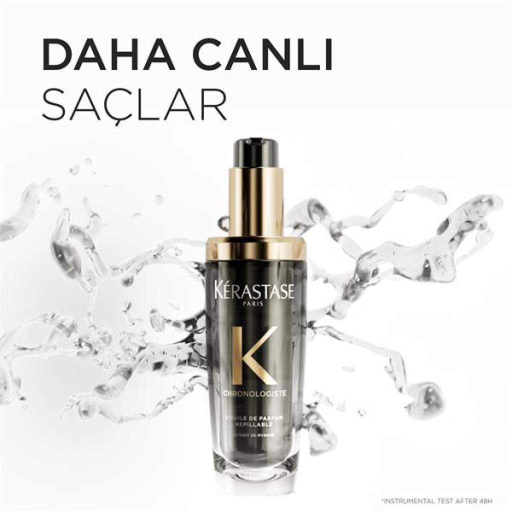Chronologiste tüm saç tipleri için uygun mudur? Evet, Chronologiste tüm saç tipleri için uygundur ve saç tellerini yoğun şekilde besleyecek ve parlak bitiş sağlayacak güzelleştirici bir formül arayan tüm kadınlar için idealdir. Neden saç yağı kullanmalıyım? Saç yağları saçların daha güçlü, daha yumuşak ve daha parlak görünmesine yardımcı olur. Ayrıca saçı dış etkenlere karşı korur. Chronologiste, saçı ısıyla şekillendiren aletlerin neden olduğu hasarlara karşı da koruma altına alır. Ne kadar saç yağı kullanmalıyım? İdeal saç yağı miktarı saçın uzunluğu, dokusu, kalınlığı ve durumu gibi faktörlere bağlı olarak 1-2 damla arasında değişir. İşin püf noktası, yağı tek seferde bir pompa kadar uygulayıp eşit şekilde dağıtmaktır. Az miktarda ürünle başlayabilirsiniz. Chronologiste'i sadece saç boylarıma mı uygulamalıyım yoksa saç derime de uygulayabilir miyim? Chronologiste sadece saç boylarına uygulanmak üzere tasarlanmıştır. Doğrudan saç derinize uygulamanızı önermiyoruz. Kérastase'ta saç derisi bakımı için geliştirilen diğer özel formüllere göz atabilirsiniz. Saç yağı ıslak saça mı yoksa kuru saça mı uygulanmalı? Bunun yanıtı hedeflediğiniz sonuca bağlıdır. Islak saça yağ uygulamak daha az parlaklık sağlar ancak saçın kolay taranmasına ve ısıdan korumasına yardımcı olur. Kuru saça yağ uygulamak ise daha iyi elektriklenme karşıtı koruma sağlar. L'Huile de Parfum Chronologiste nasıl yeniden doldurulur? 3 adımlı bir işlem sayesinde şişenizi tekrar tekrar kolayca doldurabilirsiniz: 1. Boş yeniden doldurulabilir yağ şişenizin kapağını çıkarın ve cam şişeden ayırın. 2. Yeni doldurulabilir yağ şişenizi kutusundan çıkarın ve cam şişeye takın. 3. Yeniden doldurulabilir yağ şişenizi saat yönünde çevirerek kilitleyin ve pompayı çıkararak bitmiş yeniden doldurulabilir şişenizi geri dönüştürün.