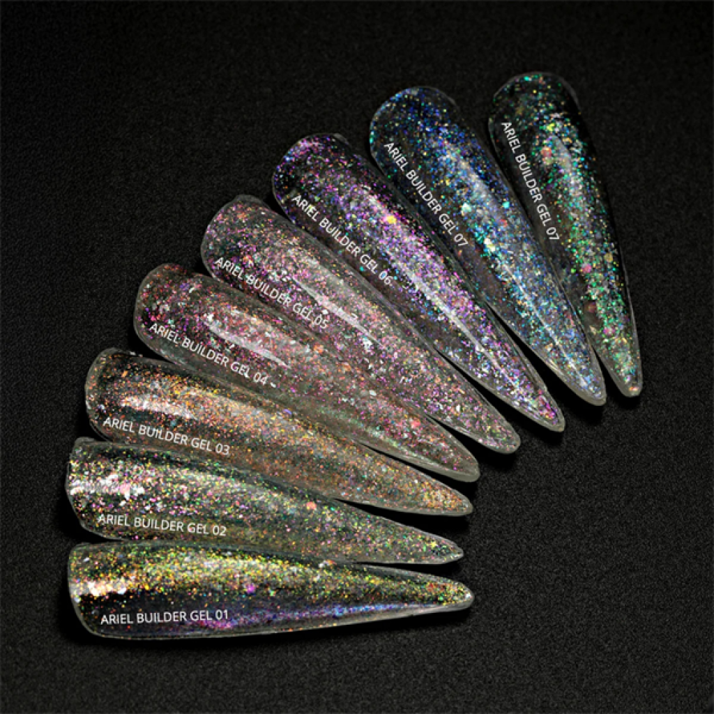 Momo Ariel Builder Gel 10gr. 04; şeffaf, holografik pembe-sarı ışıltısıyla nail art’ı “vitray” gibi gösteren simli builder jel. Işığı yakalar, bakışı çeker—abartıya kaçmadan yıldız sensin.