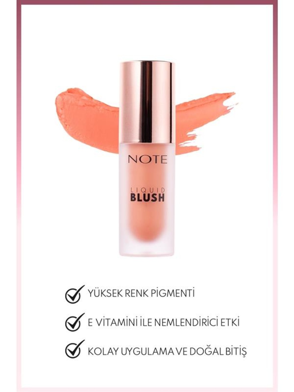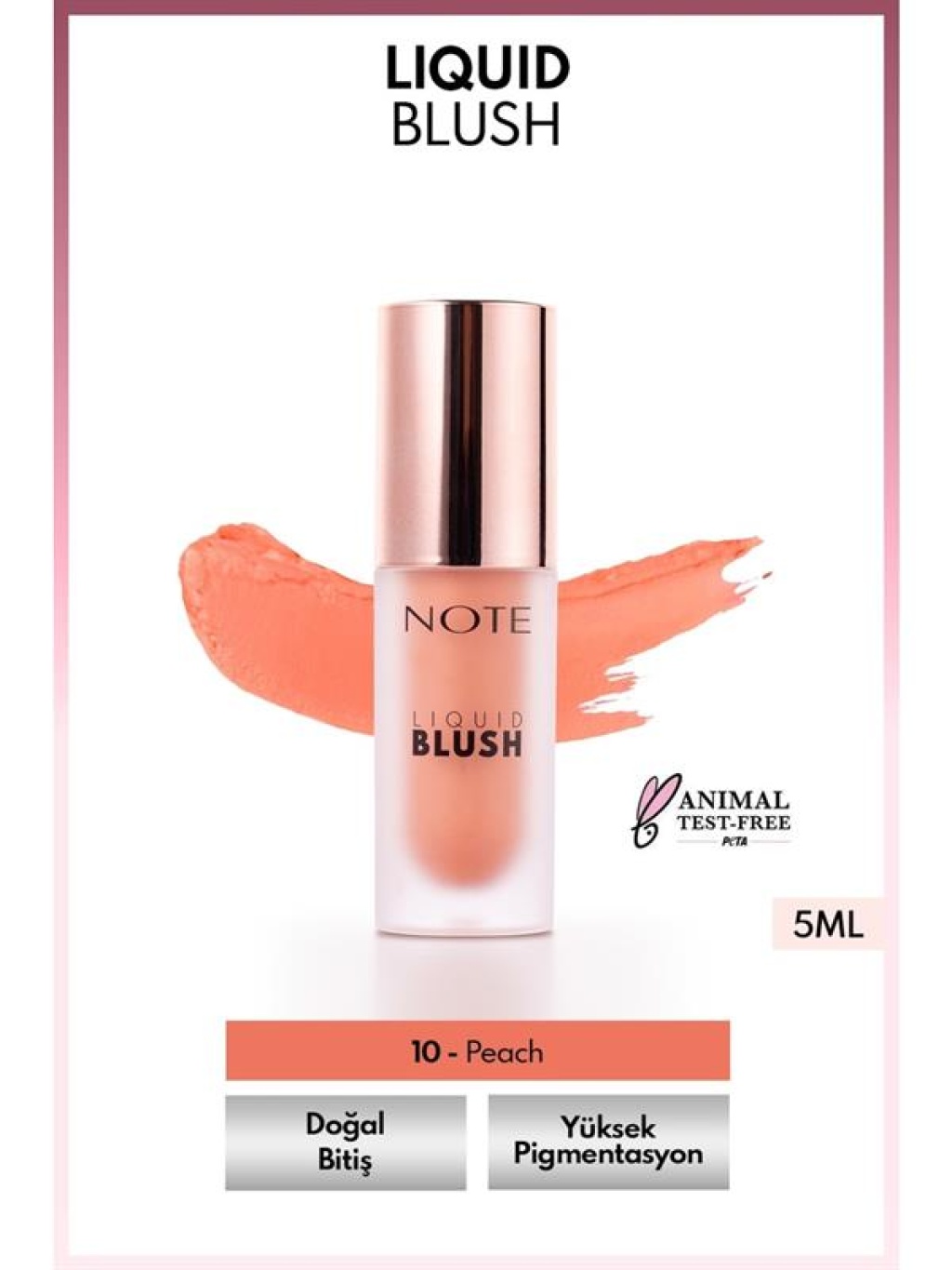 <p data-end="458" data-start="21">Note Liquid Blush 5ml 10 Peach; şeftali tonuyla yanaklara taze, canlı ve dengeli bir renk görünümü kazandırmaya yardımcı likit allıktır. Hafif yapısı sayesinde ürünü kontrol ederek kat kat uygulamayı destekler; tek dokunuşla doğal bir canlılık, katlarla daha belirgin bir etki hedeflenir. Profesyonel kullanımda fondöten üstünde pürüzsüz geçiş sağlamaya yardımcı olur, günlük makyajda ise “iki fırça darbesiyle toparlandım” hızını sever.</p><p data-end="480" data-start="460"> <