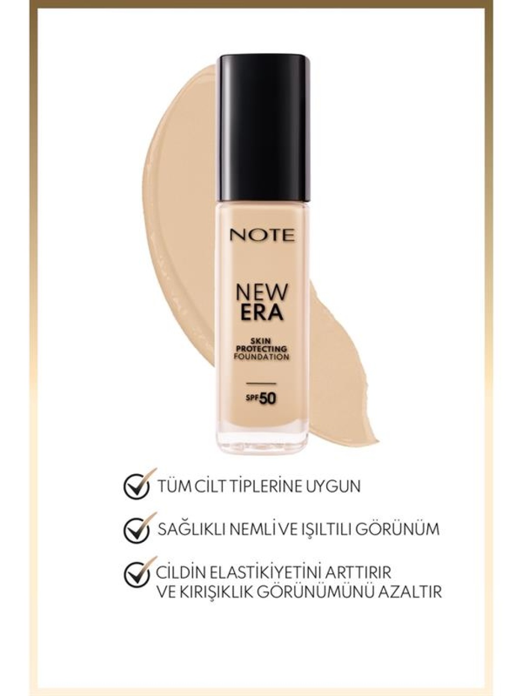 Note New Era Serisi, Makyaj Ve Cilt Bakımını Bir Arada Sunuyor. Serinin FondÖTeni YÜKsek Kapatıcılık Sunarken, Spf 50 İle Cildini GÜNeşin Zararlı Işınlarından Etkili Bir Şekilde Koruyor. İÇEriğindeki Bitkisel Hyaluronik Asit Ve Squalane İle Cildini Neme Doyuruyor, Daha Nemli Aydınlık Ve Sağlıklı Bir GÖRÜNÜMe Kavuşturuyor. Elma ÇEkirdeği Yağı, Antioksidan GÖRevi GÖRÜYor Cildini Zararlı ÇEvresel FaktÖRlere Karşı Koruyor. ÖZellikle Kuru Ciltler Başta Olmak ÜZere, TÜM Cilt Tipleri İÇİn Uygundur.