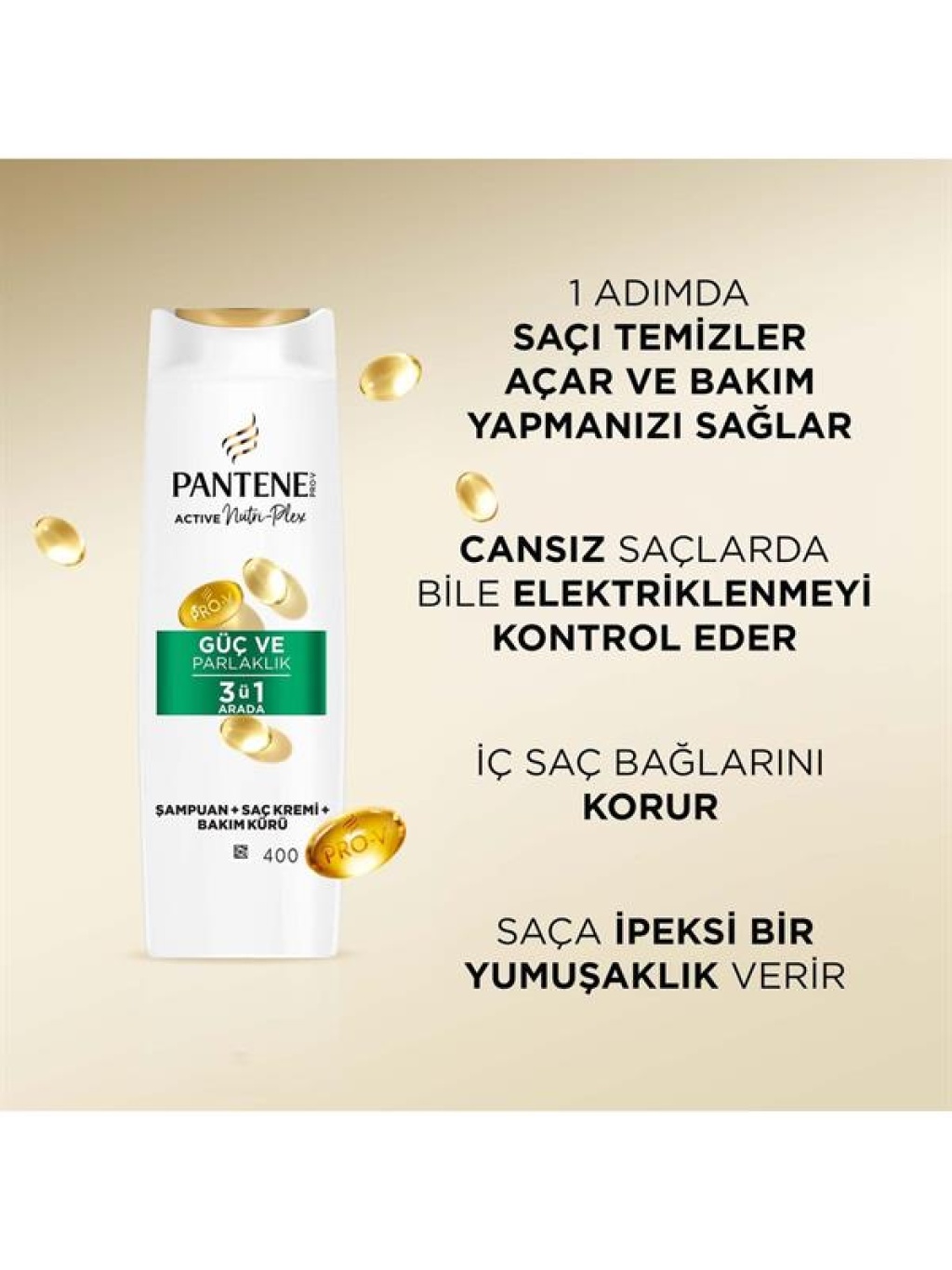 Tüm işlemleri tek adımda gerçekleştiren üstün saç bakımı çözümünüz Pantene Güç & Parlaklık 3 ü 1 Arada Şampuanı keşfedin. PRO-V ve ACTIVE NUTRI-PLEX teknolojisi ile güçlendirilerek titizlikle tasarlanmış olan bu yenilikçi ürün, saçınızı aynı anda hem temizler hem açar hem de bakım yapar. Bir şampuandan çok daha fazlası olan bu ürün, saç bağlarını koruyan ve saçları içten dışa güçlendiren kapsamlı bir bakım sağlar. İlk kullanımdan itibaren saçlarınıza gözle görülür derecede ışıltı ve güç* katan bu şampuan, saçlarınıza sağlıklı bir görünüm kazandırır. Renklendirici ve mineral yağ içermeyen formülüyle saçları saç şekillendirme işlemlerinin neden olduğu yıpranmalara karşı güçlendirerek saç yüzeyini uçlarına kadar yeniler ve saçlarınızı iyileştirir. Swiss Vitamin Institute tarafından test edilmiştir. *Saç şekillendirme işlemlerinin neden olduğu yıpranmalara karşı güçlendirme