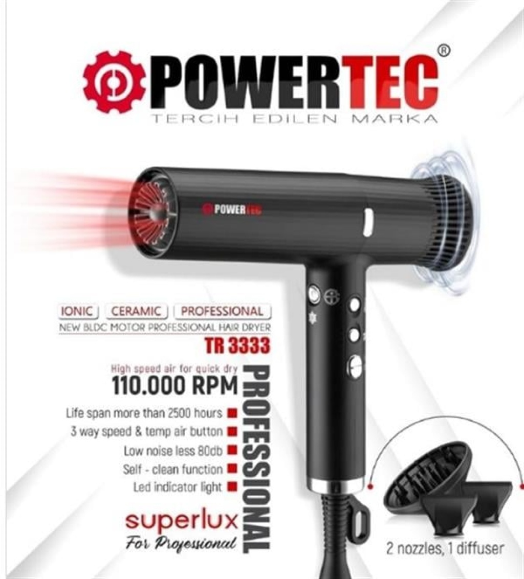 Powertec Ionic Fön Makinesi TR-4444B (Siyah), saç kurutma ve şekillendirme işlemlerinde profesyonel sonuçlar elde etmek için geliştirilmiştir. Yüksek performanslı AC motoru sayesinde hızlı kurutma sağlar, iyon teknolojisi ile saçın elektriklenmesini ve kabarmasını önler.
