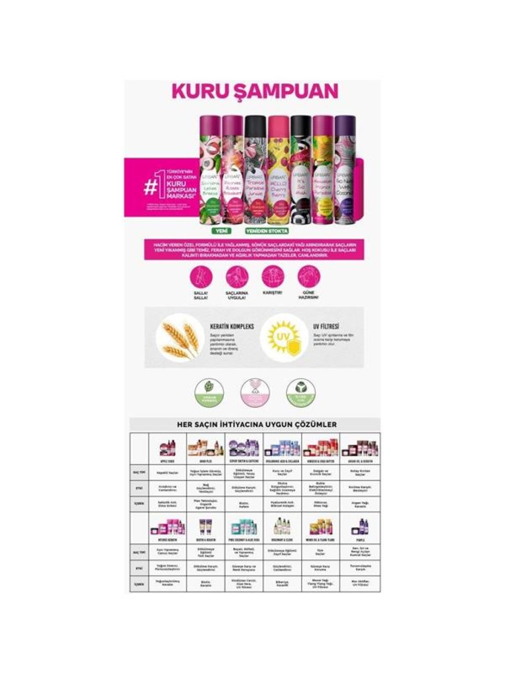 Şakayık ve Gülün baş döndürücü kokusu ile 1 dakikada saçlarınızı yeni yıkanmış gibi temiz, ferah ve dolgun hissetmeniz için geliştirilen URBAN Care kuru şampuan; hacim veren özel formülü ile yağlanmış, sönük saçlardaki fazla yağın giderilmesine yardımcı olur. Hoş kokusu ile 1 dakikada tazelenmiş, canlı ve dolgun saçlar sunar. Çiçeksi ferahlık tüm gün sizinle! UV filtresi içerir. Vegan içeriğe sahiptir. Hayvanlar üzerinde test edilmez. Bakım Önerisi: Saçların daha hacimli, temiz görünmesi için günün her saati uygulanabilir. Saçlara 20 cm uzaktan sprey edilir.