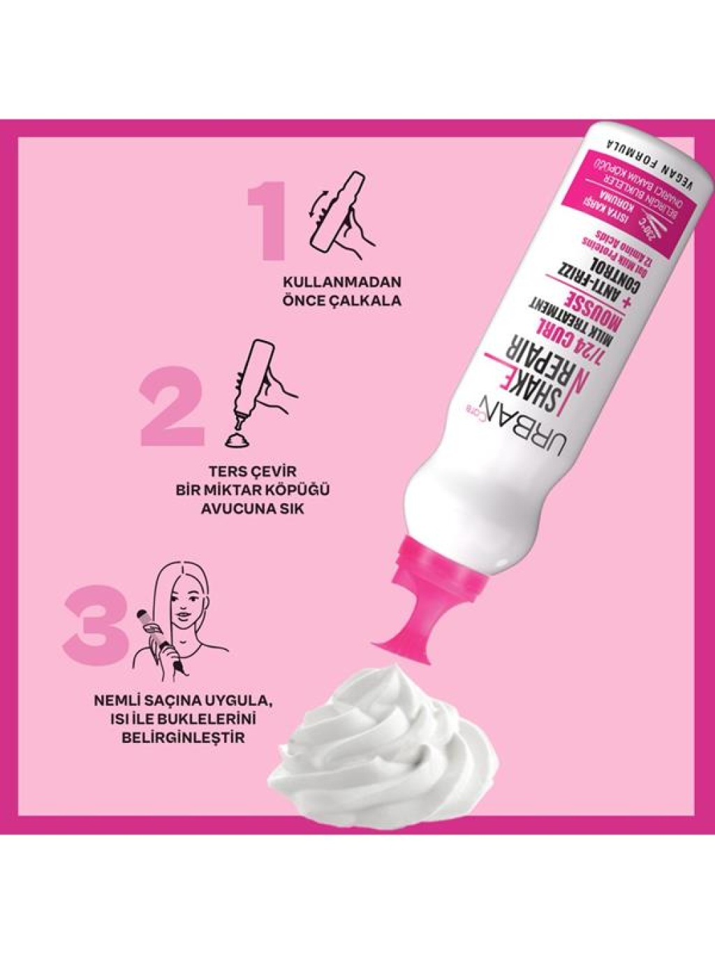Bakım Önerisi: Kullanmadan önce iyice çalkalayınız. Ters çevirerek avucunuza bir miktar sıkınız. Nemli ya da kuru saça eşit bir şekilde yayarak uygulayınız. Durulamayınız. Dilediğiniz gibi şekillendiriniz. Uyarılar: Kutu basınçlıdır. Delmeyiniz ve ateşe atmayınız. Direk güneş ışığından ve 50°C’nin üzerindeki sıcaklıklardan koruyunuz. Yeterli havalandırılmış yerlerde kullanınız. Yüze, gözlere ve ateşe püskürtmeyiniz. Çocukların uluşamayacağı yerlerde muhafaza ediniz. Sadece haricen kullanım içindir. Sigara içmeyiniz.